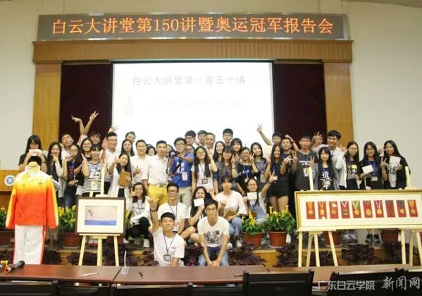 10月20日晚,我校第十九届校园文化艺术节之“奥运冠军进校园”活动暨白云大讲堂第150讲在儒学堂隆重开讲,国家级跳水教练胡恩勇、世界跳水冠军余卓成、奥运跳水冠军孙淑伟为我校学生带来了以“因梦想成就冠军”为主题的奥运冠军成长报告会讲座,吸引了众多学生的参加。