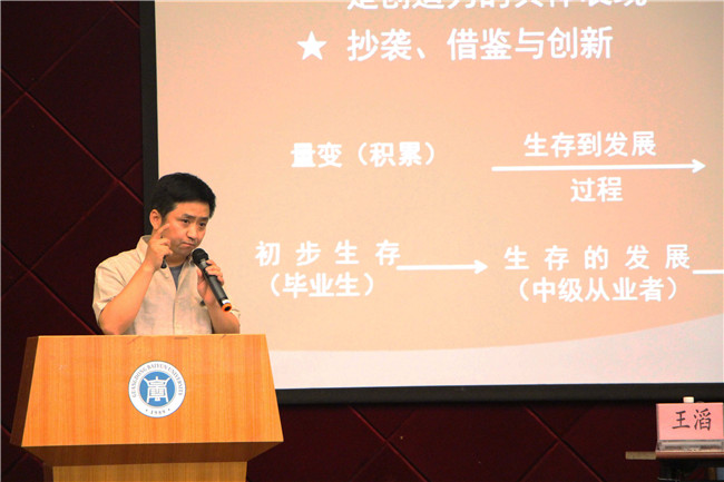 最后,王滔引用三句古诗概括了三个阶段与广大建筑与艺术的同学们共勉。第一阶段称之为寻路阶段“昨夜西风凋碧树,独上高楼,望断天涯路”指的是广大学子刚接触建筑与艺术的迷惘阶段;第二阶段是为目标奋斗的阶段“衣带渐宽终不悔,为伊消得人憔悴”则指出了设计师找到前进的方向、期望的目标、并为之奋斗的过程;第三阶段则为反思阶段“那人却在灯火阑珊处”,认为当我们获得成功时淡定而不张扬。