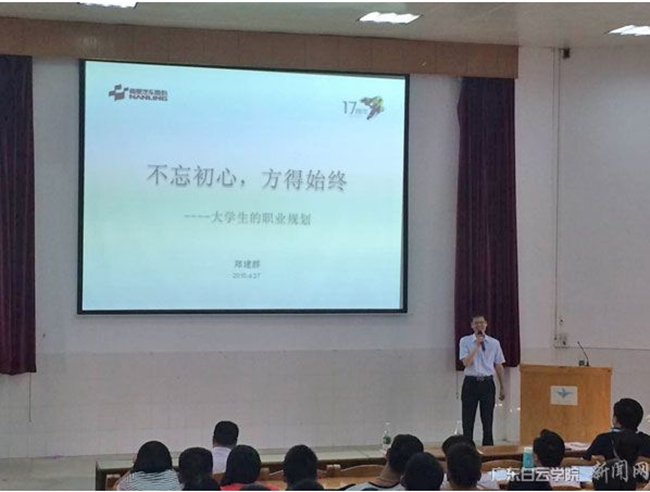 5月12日,由学生处和机电工程学院组织的白云大讲堂第117讲在思齐楼312室隆重开讲。此次讲座特邀广州南菱汽车运营副总裁、广东白云学院客座教授郑建群先生为同学们作了题为“不忘初心,方得始终——大学生的职业规划”的精彩讲座,受到机电学院师生的热烈欢迎,机电学院院长张国庆教授、党总支书记刘芳文出席了本次活动。