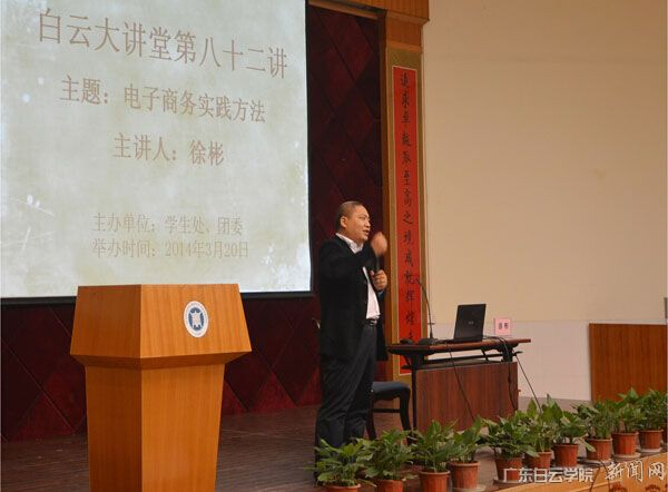 为了帮助同学们更好地了解电子商务的发展趋势,3月20号,由学生会和团委组织举办的“电子商务实践方法”讲座在儒学堂开讲,广州市湛隆网络科技有限公司总经理、广州市白云区电子商务协会秘书长徐彬先生受邀作了精彩演讲。