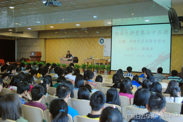 为进一步推进素质教育,传承和弘扬中华民族优秀传统文化,培养同学们对书法的兴趣,陶冶情操,11月14日,白云大讲堂第七十五讲“书法艺术与修身养性”在小礼堂开讲。白云学院有幸邀请到中国书法家协会理事陈新亚先生为白云学子做专题演讲。副校长侯立兵教授主持了演讲会。