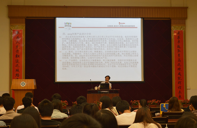 此次讲座,郭总分三个部分:首先,第一部分概述了我国办公家具的发展史及部分生产流程的具体情况,重点阐述了人造板的发展情况;其次,第二部分介绍了办公家具设计理念及办公家具产品设计的保证体系,并强调在办公室家具中应特别注重产品设计的原创性、材料的环保性、安全性和人体舒适性等;最后,第三部分对办公室家具的设计灵魂所蕴含的博大的文化内涵进行了深入浅出的阐述。