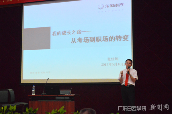 5月10号,东莞东风汽车销售服务有限公司长安分公司总经理张佳锦回到母校,为学弟学妹们作了白云大讲堂之62:“从考场到职场的转变”的讲座,并分享了他大学毕业后的职场经历之路。此次讲座爆棚,儒学堂座无虚席。