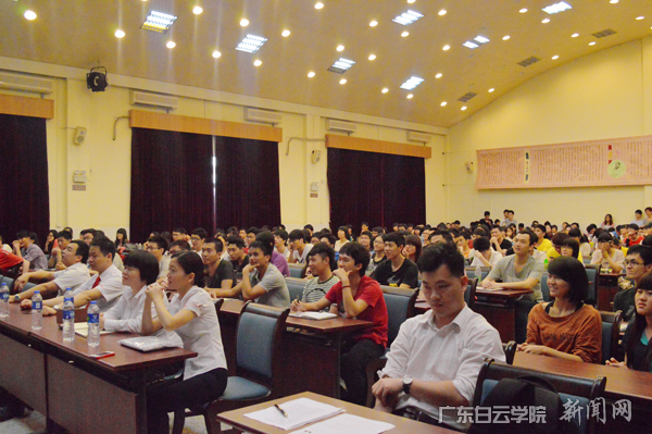 讲座伊始,张总热情地邀请8名学生上讲台做“抢凳子”的游戏。白云大讲堂迄今为止,这是第一次由游戏的形式开始讲座,不仅吸引了同学们的兴趣,也活跃了现场的气氛。张总主要从校园到社会、从校园人到职场人这两方面入手,并对其进行详细讲解,同时列举有关自己的成功案例,告诫学生职场中、学习中都需脚踏实地,学会从基层做起,一步一个脚印才是最好的成功理念。