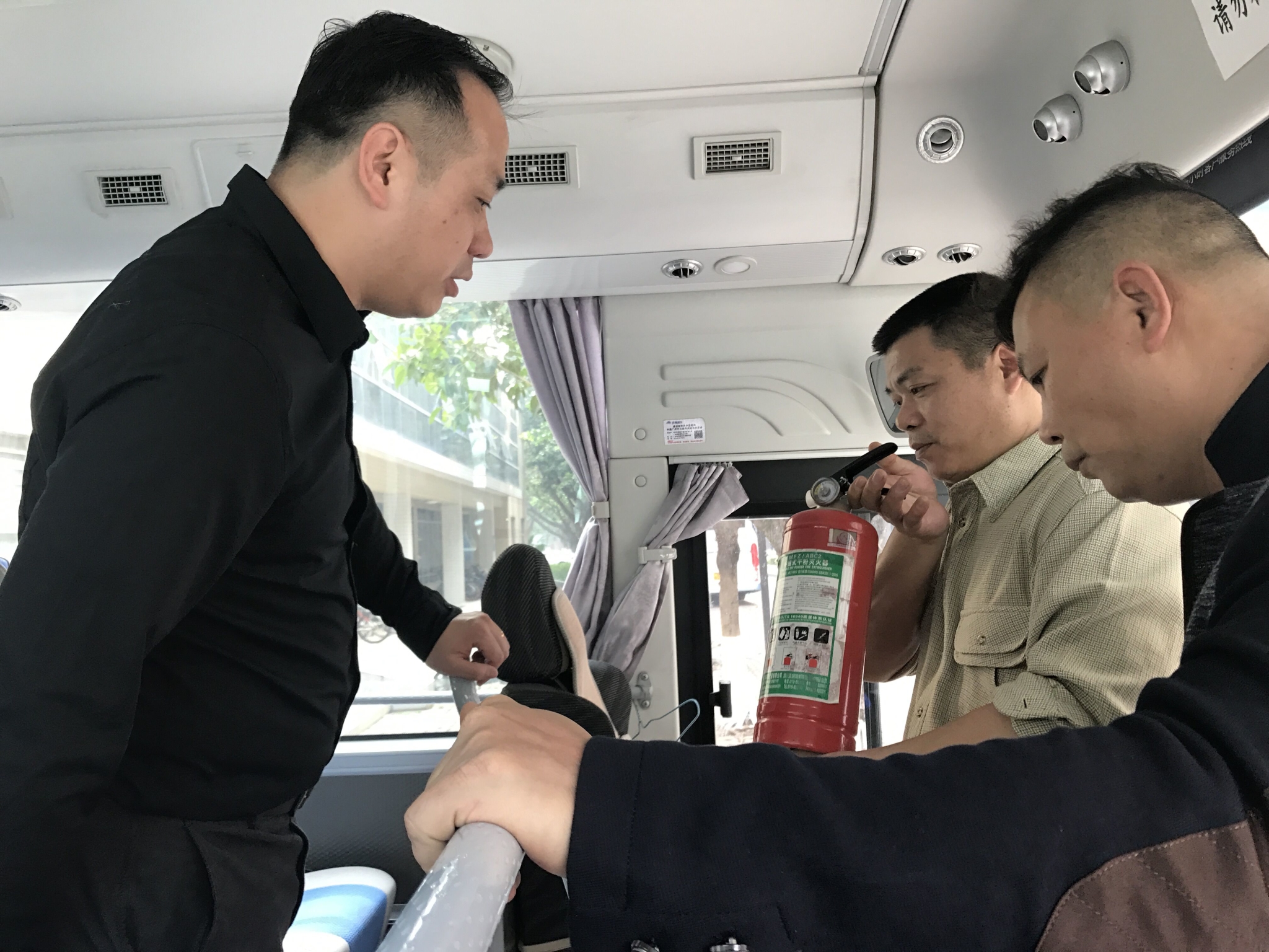 校长助理陈峰(左一)在检查车辆消防设备安全