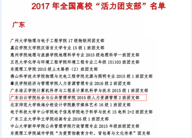 近日,共青团中央学校部公布了2017年全国高校“活力团支部”创建遴选活动结果。我校团委推荐的社会与公共管理学院2015级人力资源管理2班团支部在众多参评支部中脱颖而出,荣获全国高校“活力团支部”称号。