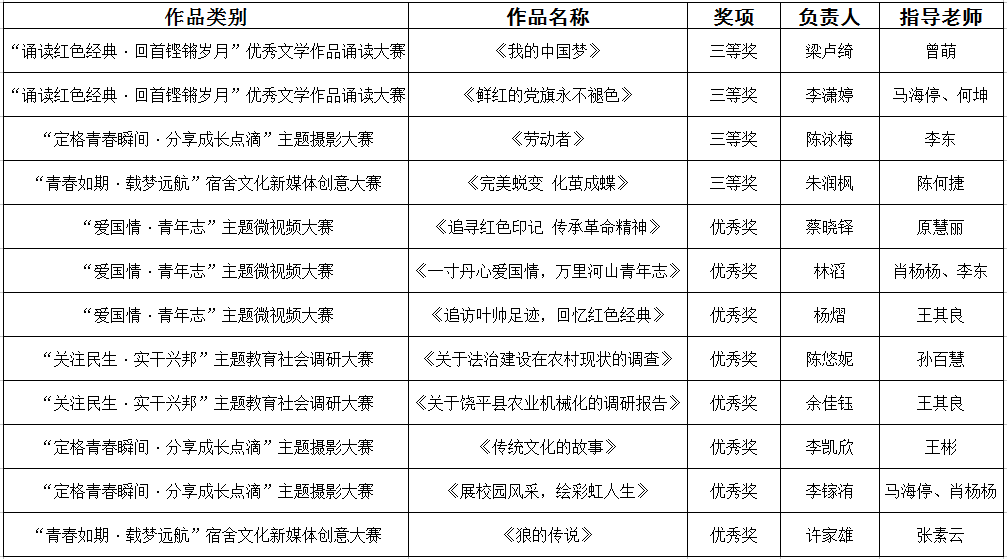 其中,由社会与公共管理学院曾萌老师的、社会与公共管理学院2016级人力资源管理2班梁卢绮同学担任负责人的作品《我的中国梦》与学生处马海停老师和何坤老师指导的、艺术设计学院2015级服装设计与工程2班李潇婷同学担任负责人的作品《鲜红的党旗永不褪色》获得“诵读红色经典·回首铿锵岁月”优秀文学作品诵读大赛三等奖;由建筑工程学院李东老师指导的、建筑工程学院2016级工程造价1班陈泳梅同学担任负责人的作品《劳动者》获得“定格青春瞬间·分享成长点滴”主题摄影大赛三等奖;由工商管理学院陈何捷老师指导的、2016级工商管理三班朱润枫同学担任负责人的作品《完美蜕变 化茧成蝶》获得“青春如期·载梦远航”宿舍文化新媒体创意大赛三等奖;由会计学院原慧丽老师指导的、会计学院2015级会计学3班蔡晓铎同学担任负责人的作品《追寻红色印记 传承革命精神》、由建筑工程学院肖杨杨老师和李东老师指导的、建筑工程学院2014建筑学一班林滔同学担任负责人的作品《一寸丹心爱国情,万里河山青年志》、由应用经济学院王其良老师指导的、2016级金融学4班杨熠同学担任负责人的作品《追访叶帅足迹,回忆红色经典》共同获得“爱国情·青年志”主题微视频大赛优秀奖;由应用经济学院孙百慧老师指导的、应用经济学院2015级金融学6班陈悠妮同学担任负责人的作品《关于法治建设在农村现状的调查》和应用经济学院王其良老师指导的、B16金融学6班余佳钰同学担任负责人的作品《关于饶平县农业机械化的调研报告》获得“关注民生·实干兴邦”主题教育社会调研大赛优秀奖;由外国语学院王彬老师指导的、外国语学院B16英语5班李凯欣同学担任负责人的作品《传统文化的故事》和学生处马海停老师、建筑工程学院肖杨杨老师指导的、建筑工程学院15级工程管理专业李镓洧同学担任负责人的作品《展校园风采,绘彩虹人生》获得“定格青春瞬间·分享成长点滴”主题摄影大赛优秀奖;由机电工程学院张素云老师指导的、机电工程学院汽车服务工程2015级许家雄同学担任负责人的作品《狼的传说》获得“青春如期·载梦远航”宿舍文化新媒体创意大赛优秀奖。
