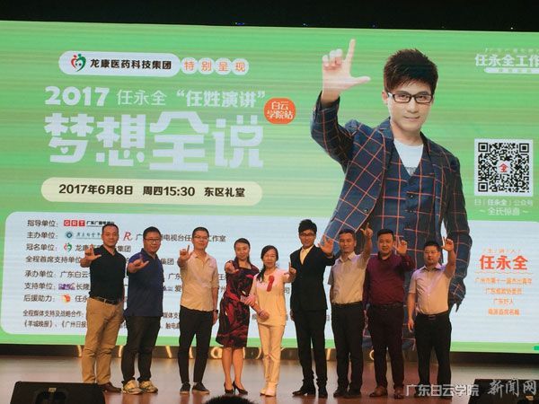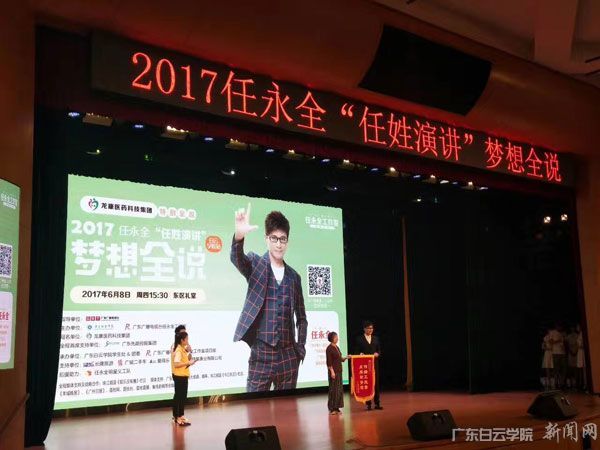 为了更好地让我校学生分享到正能量梦想,鼓舞引导正确的人生价值观。6月8日下午,校团委在东校区大礼堂隆重举行2017任永全“任姓演讲”梦想全说正能量公开课。广东广播电视台珠江频道副总监任永全,著名教育专家黎秋华,龙康医药科技集团运营中心总经理潘叶挺,龙康医药科技集团人力资源部部长赵慧,广东白云学院校党委副书记李纯英,广东白云学院学生处处长陈峰,广东先路控股集团首席营销官黄文赞,金利达汽车美容养护中心董事长钟庾生,广州动特酷表业有限公司董事长罗赐亮,广东广骏汽车实业有限公司副总经理唐暖康,广东广骏汽车实业有限公司副经理肖铭杰,校团委领导、嘉宾等应邀出席。本次公开课主题新颖独特,吸引了众多同学前来听课,共800余人参加。