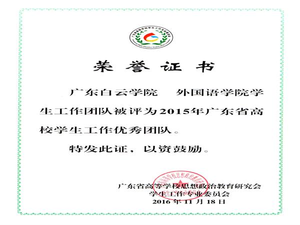 近日,从广东省高校学生工作专业委员会《关于表彰2015年学生工作先进个人、优秀团队、第七届学生工作“红棉奖”、第四届“高校学生事务管理精品项目”的决定》的文件获悉,我校外国语学院学生工作团队荣获“2015年广东省高校学生工作优秀团队”,校团委段立老师荣获“2015年广东省高校学生工作先进个人”。