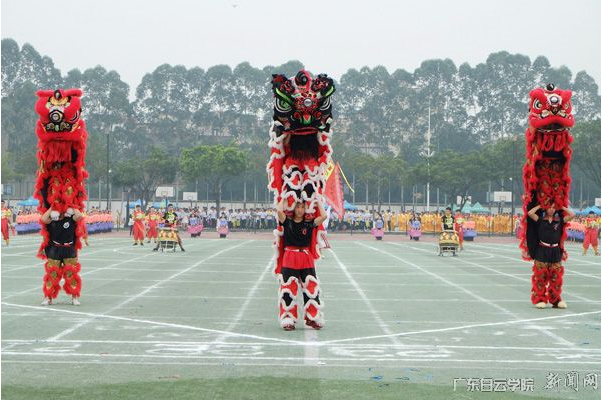 而激动人心的则非开幕式文艺表演莫属。在激昂雄浑的音乐声响起时,在章海森、黄小津两位同学热情、动人的解说进行时,师生瞩目、众人期盼的《逐梦白云》系列文体艺术节目闪亮登场,标志着运动会开幕式进入高潮。(1)传统体育龙狮表演(指导老师李东彪、张林)首先亮相,来自龙狮团和武术俱乐部的健儿们敲响了喧天锣鼓,绿茵场上,只见龙腾狮跃、拳打脚踢、凤凰展翅、刀来枪往,演绎出了一幅幅威风凛凛、大气磅礴的龙风狮姿。(2)啦啦操表演(指导老师郭晓静)则欢快灵动,充满现代韵味,将一群身姿矫健、青春靓丽的少男少女们健康活泼的形象直观二鲜活地呈现给我们。(3)体育舞蹈表演(指导老师吴小丽)为大家带来了拉丁舞与摩登舞的国标式演出,热情的恰恰、欢快的牛仔、激烈的斗牛和柔情的伦巴,还有热烈狂放的探戈、加上华丽优雅的华尔兹,来自校体育舞蹈队的俊男美女们为师生奉献了一场名副其实的视觉盛宴。(4)在悠扬舒缓的背景音乐映衬下,瑜伽协会(指导老师郭晓静)献上了属于他们的“青花瓷”,400多名演员展示了动与静、淡与雅、刚与柔的完美结合,优雅的动作、婀娜的形体,让师生们仿佛进入了瑜伽梦幻般的世界。(5)军训教导大队400余人表演的“白云魔方”(指导老师戴立新),上百个旗语动作整齐划一、干脆利落,演绎了“0”到“9”数字传奇,不是动漫胜似动漫,不着军装亦有军魂,他们带来的视觉冲击一样惊艳全场。(6)压轴好戏是“千人太极”(体育教研室教师集体指导)。1100余名2016级白云学子伴音而起、随声而定,动而不急、急而不燥,进退有序、聚散有度,将“白云”扇的挥舞与太极运动的灵巧完美融合,那一声声的“唰”、那一道道的“环”,急缓相间、行云流水,是中华太极文化在白云的精彩演绎!