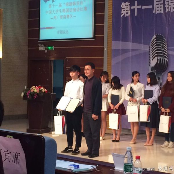 11月27日,由中国人民对外友好协会、中国韩国友好协会主办,锦湖韩亚集团等承办的第十一届“锦湖韩亚杯”中国大学生韩国语演讲大赛两广海南赛区在广东外语艺术职业学院隆重举行。我校2014级朝鲜语专业学生梁健聪、马佳仪代表我校参加了本次比赛,并且在比赛中获得“优秀奖”。