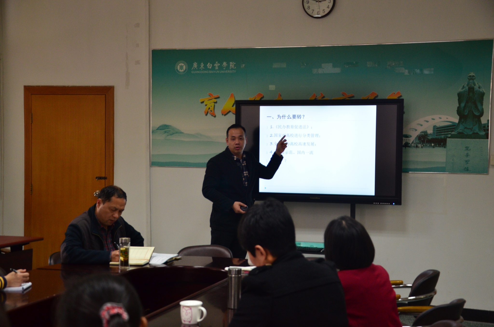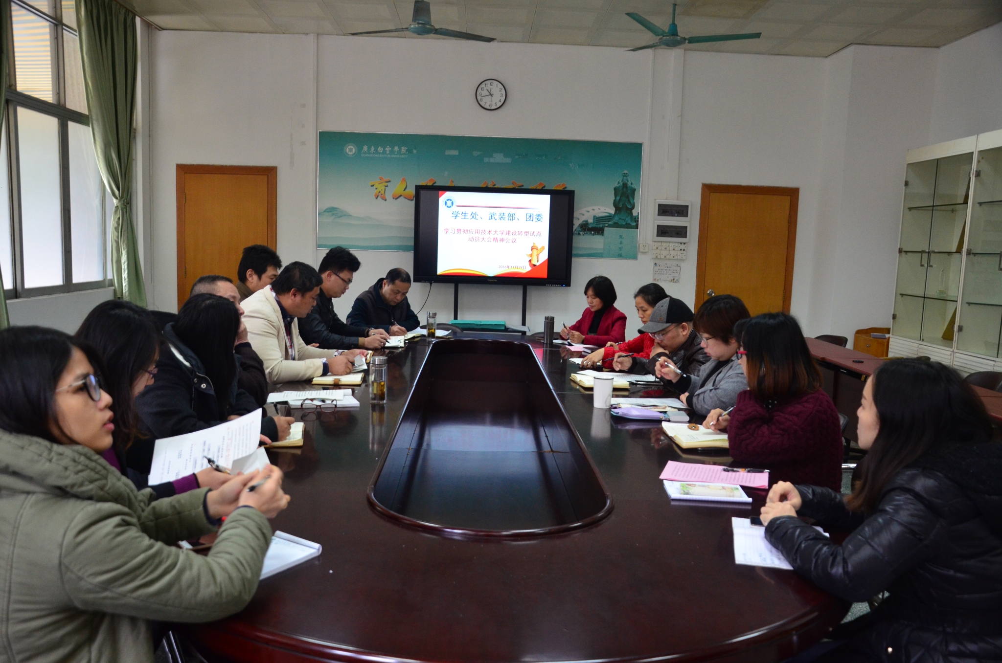 11月29日,学生处、武装部、团委在会议室召开学校转型试点动员大会讲话与发言材料学习会议,会议由学生处副处长邓建侠主持,全体学生处人员参加。