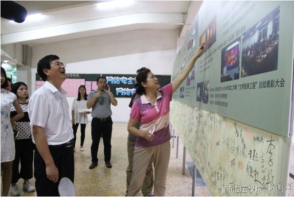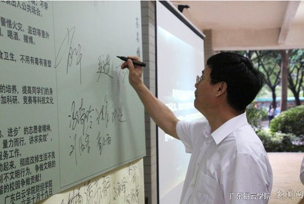 活动得到学校领导的大力支持,校党委书记刘剑锋亲临现场指导。刘书记首先对本次阶段成果展的设计、展示的成果以及开展过的活动取得的成绩表示了肯定,并要求各基层单位要进一步的做好“文明修身工程”活动的计划,要把计划落实到实处,提高活动的质量、效果以及扩大影响,让每一位学生都积极的参与到活动中。刘书记希望通过系列活动提高学生的思想政治素质,提高学生的综合素养,提高党员的党性。最后刘书记在签名墙上写下了自己的名字,这一刻激励了在场的所有师生,更加坚定了做好“文明修身工程”的决心。