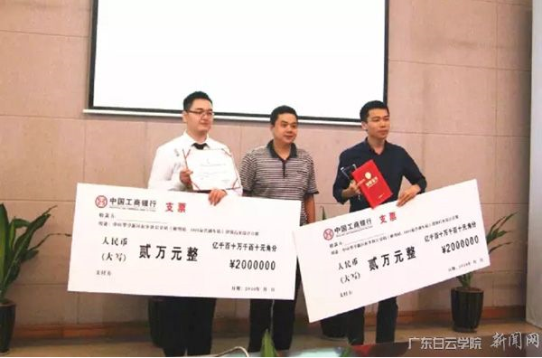 翠亨新区公共建设局周礼坤副局长(中)给我院获奖代表梁竞宇(左)颁发获奖证书和奖金