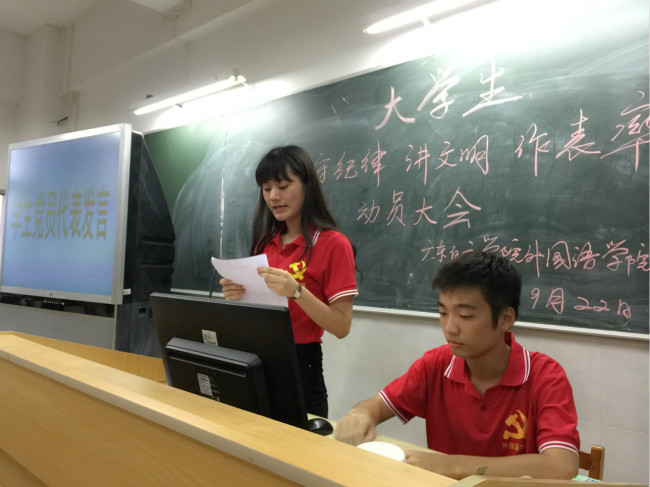 为培育和践行社会主义核心价值观,提高我院大学生的综合素质,培养大学生文明行为,共建文明和谐校园,9月22日晚上,外国语学院、国际学院在信达506多媒体教室组织召开“守纪律、讲文明、作表率”动员大会。外国语学院、国际学院党总支书记朱玲、英语学生党支部书记贺满云、日韩学生党支部书记杨恩正、团总支书记梅俊强、全体辅导员老师及学生党员、团学干部与各班班长、团支书、2015级班导师助理参加了本次的动员大会。