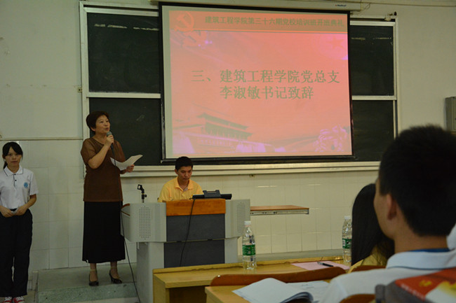 伴随着庄严的国歌,建筑工程学院第三十六期党校培训班开班典礼拉开了序幕。首先,李淑敏书记上台发表重要讲话,她强调大家要端正态度,端正入党动机,正确认识入党积极分子接受培训的重要意义。同时,还要求每一位学员严格遵守培训班的纪律,希望同学们早日成为一名真正意义上的中国共产党员。紧接着,学生第一党支部书记马先华老师上台讲话,他要求学员们以实际行动响应新时期发展的新要求。