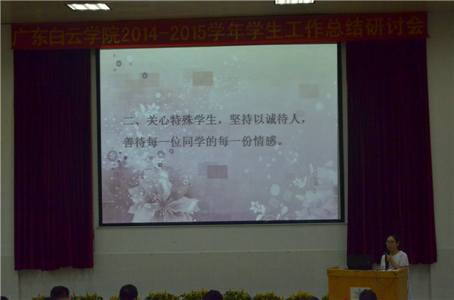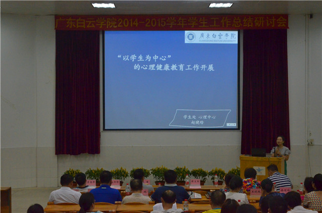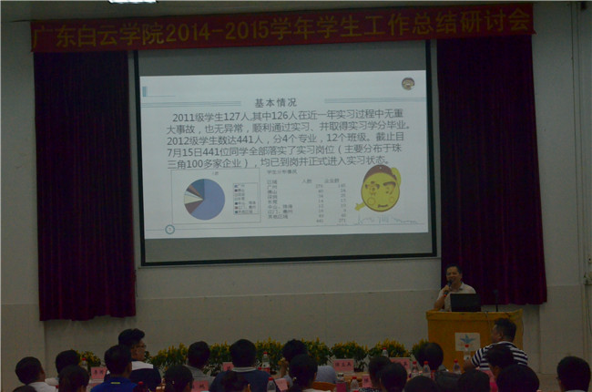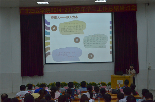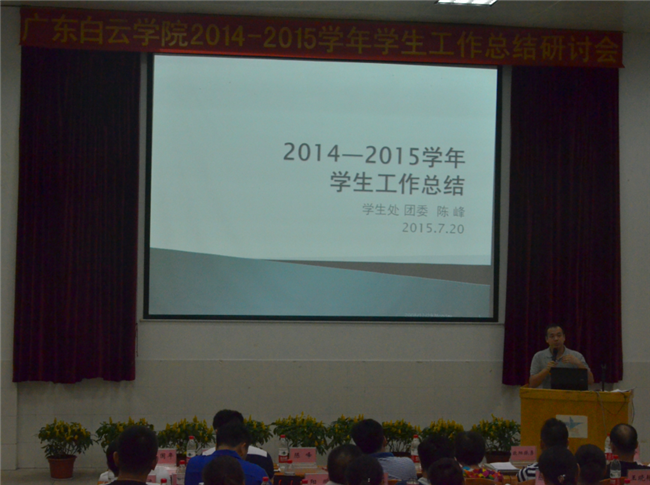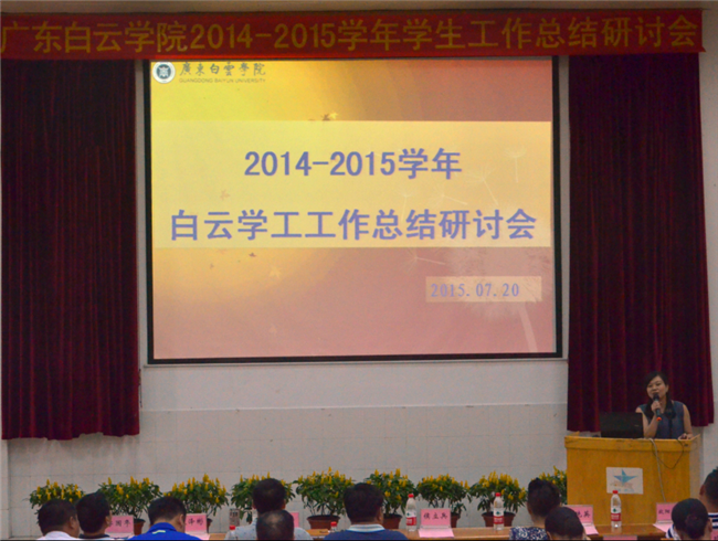 7月20日,广东白云学院2014-2015学年学生工作总结研讨会在思齐楼312隆重召开。党委副书记李纯英、侯立兵副校长、以及全体学生工作线的老师共115余人参加了会议。