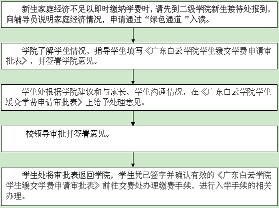 欢迎同学们考入广东白云学院,为确保家庭经济困难新生顺利入读,完成学业,根据国家相关资助政策,特开通新生入学“绿色通道”,具体流程如下: