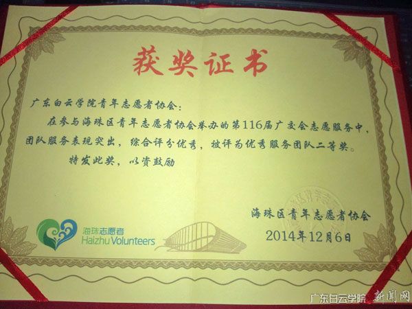12月6日晚,广东白云学院青年志愿者服务团队受海珠区青年志愿者协会邀请,参加“第116届广交会表彰大会"晚会。