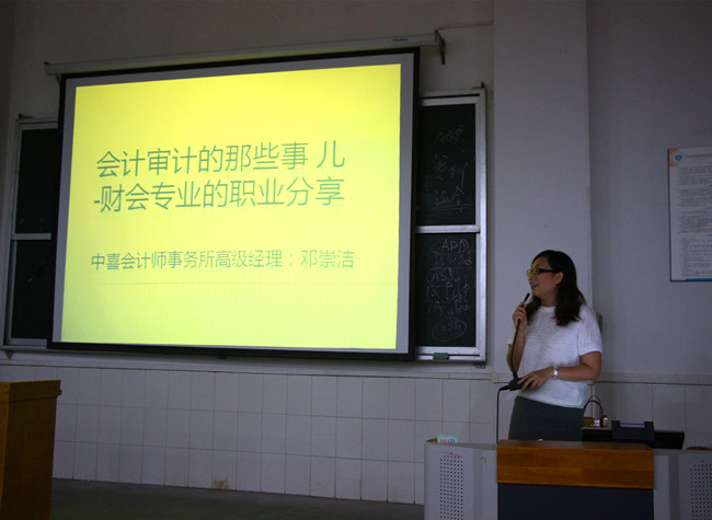 9月11日, 我校财经学院特邀中喜会计师事务所广东分所高级经理邓崇洁女士来校作“财会专业职业规划”讲座,财经学院领导、2012级学生共250人参加了讲座。