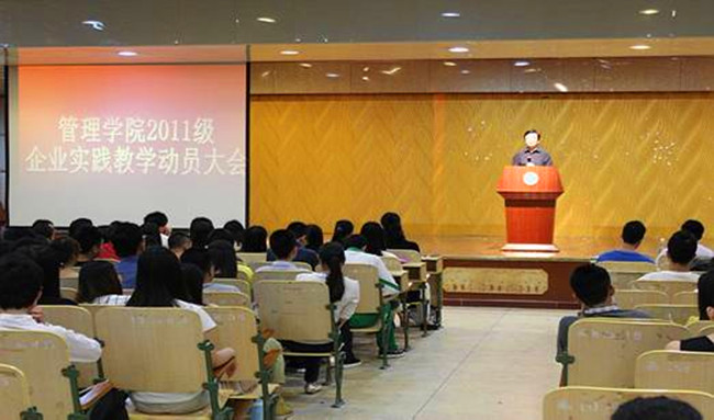 在本次动员大会上,管院院长李新庚从企业实践教学的目的、意义和重要性出发,启发2011级本科学生重视企业实践教学,认真参与,积累实践经验。企业代表李萍女生向2011级的学生们讲解了大学生五年职业规划及大学生就业创业问题,她讲解的内容总结概括为五个字——“学”、“管”、“监”、“副”、“CEO”。这五个字精炼地概括出了同学们踏入社会仍需加强的几大方面。紧接着我校99级营销专业的陈益艺师兄也向同学们发表了演讲,他的演讲以“坚持”为主线,用自己毕业后工作的亲身经历向同学讲述了如何通向成功,他的演讲得到了同学们的热烈反响。