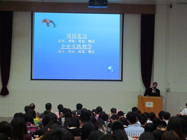 学工部陈峰部长从全国大学生就业形势、高等教育人才培养模式改革现状,阐述了学校实行“产教融合、校企合作、工学结合”的企业实践教学的可行性、必要性和准备工作。陈部长告诉同学们,学校已经为推动企业实践教学投入了大量的人力物力,并进行了扎实的前期调查与研究工作。在机电学院、电气与信息工程学院的部分进行了长期专业试点,受到企业和社会的高度认可;目前全校按照1:1.2的比例开发了实习岗位(到五月底将达到1:1.5)供学生选择;为了保证企业实践教学每一个环节能够落到实处,让学生在真实场景中学到知识,学校配备了四导师(企业导师、专业导师、职业导师、思政导师),制定并完善了30个与企业实践教学相关的制度和措施。