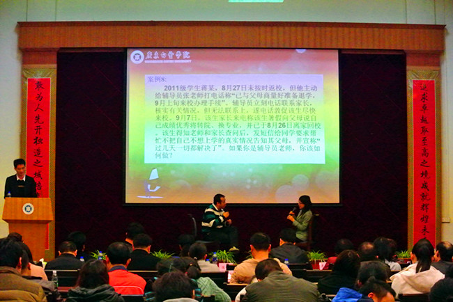 3月6日上午,在儒学堂进行笔试前8名选手的技能展示环节比赛。在技能展示环节开始之前,2013年广东省辅导员职业技能竞赛优秀选手王晓艳老师做了经验交流,她根据去年参加省教育厅的培训经历及自身参赛的心得体会,从主题班会、基础知识测试与写作、自我展示与案例分析、谈心谈话4个方面进行了详细介绍,给在场的每一个人带来了职业竞赛活动与学生工作的新思路和新方法,让大家受益良多。