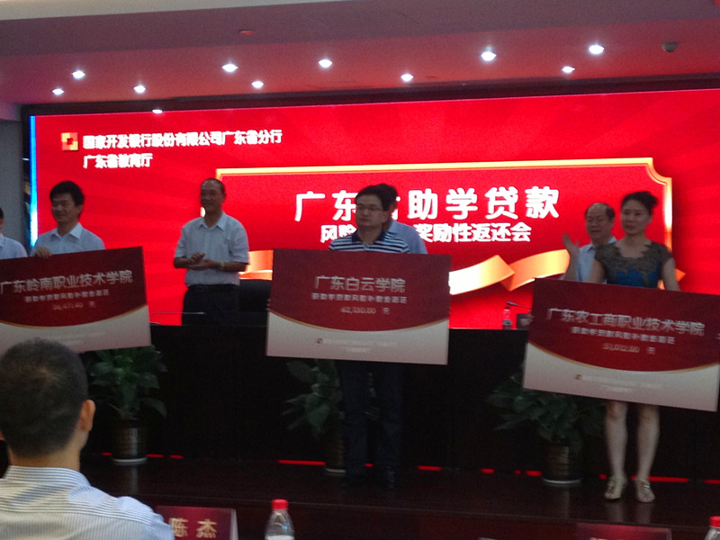 2013年5月30日广东省高校国家开发银行助学贷款风险补偿金首次返还会议在国家开发银行广东省分行召开,出席会议的领导有国开行广东省分行行长吴德礼、广东省教育厅副厅长李学明,应邀出席的还有全省20所助学贷款风险补偿金全额返还高校代表,我校侯立兵副校长等一行四人受邀出席此次会议。自2009年以来,我校助学贷款一直保持零违约,助学贷款风险防范与控制成效显著,受到省厅的认可与好评,此次更是得以全额返还首次贷款风险补偿金,共计62130元。