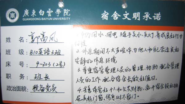 全校于5月7—17日如期举行了“示范床”标签挂牌活动。在统一制作的标签上,全体“文明宿舍”的同学庄重写下了个人在“文明宿舍”创建中的承诺。在此项活动中,“文明与个性—设计学习” 文明宿舍创建项目组成员在检查中发现,有党员、班长、团支部书记的宿舍90%的内务卫生达到了优秀水平,在四月份评比出的“文明宿舍”中有党员、班长、团支部书记的宿舍也占60%,由此可见,“我是一面旗帜”活动在学生日常行为习惯中的重要作用。
